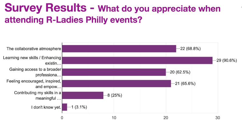 In true R-Ladies Philly fashion, Alice and Karla amassed and visualized survey data demonstrating what our members appreciate about our meetups: